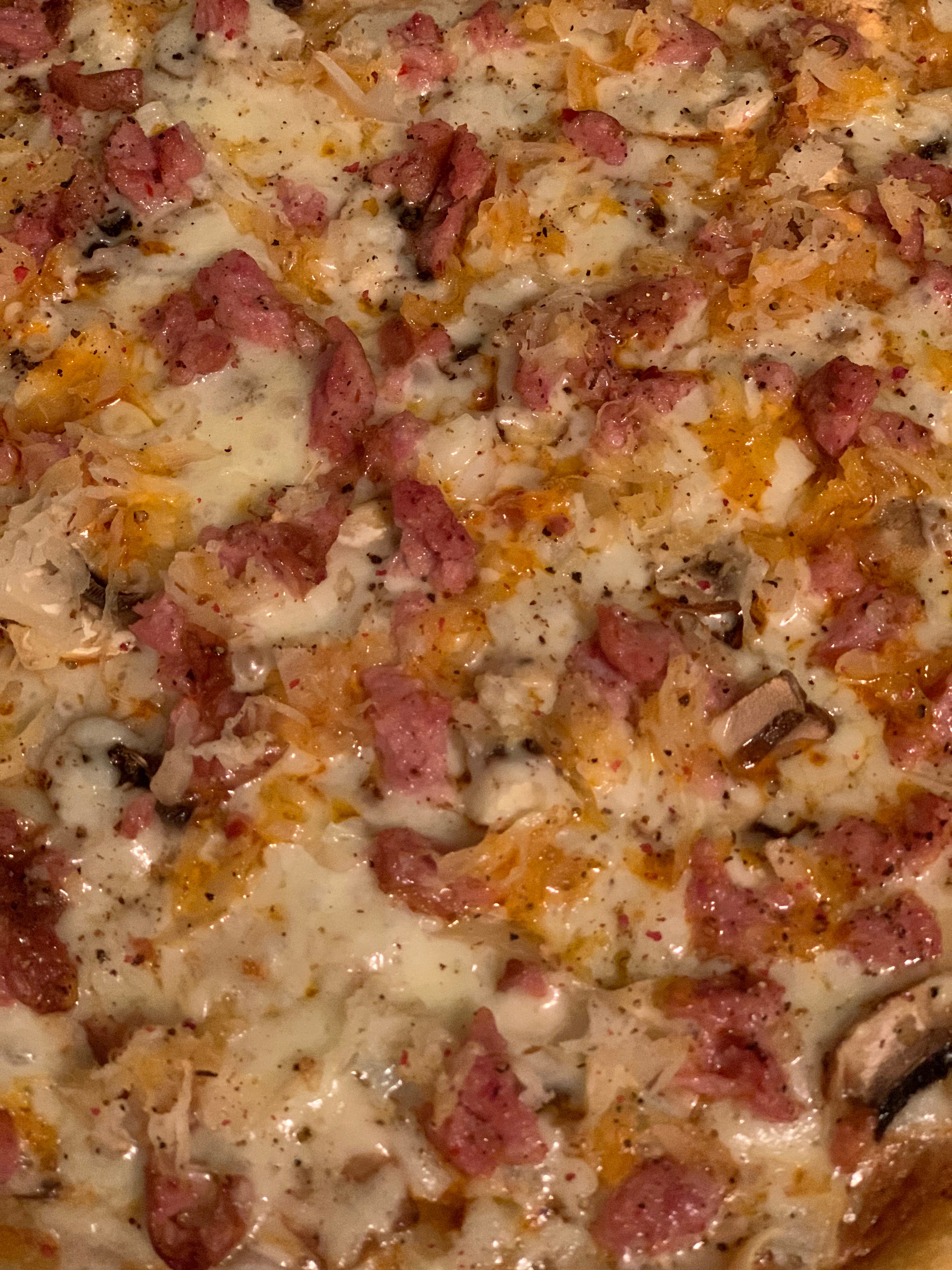 My boyfriend and I, completely sober, thought what would taste fucking amazing would be a German-cuisine topped pizza. Beer-cheese sauce. Sauerkraut. Bratwurst. Swiss cheese. We held back from topping this delicious Frankenstein with Limburger, the worst smelling and most disgusting tasting cheese I have ever allowed into my home. Yes; my boyfriend did spend $6 on 8 ounces of the worst damn thing I’ve ever tasted. The pizza was good tho. 8/10.